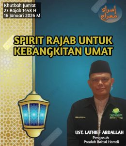 Khatib : Ust. Lathief Abdallah.C.LQ اَلْحمْدُ لِلهِ الَّذِي أَنزَلَ السَّكِينَةَ فِي قُلُوبِ الْمُؤْمِنِينَ لِيَزْدَادُوا إِيمَانًا مَّعَ إِيمَانِهِمْ ۗ وَلِلَّهِ جُنُودُ السَّمَاوَاتِ وَالْأَرْضِ ۚ وَكَانَ اللَّهُ عَلِيمًا حَكِيمًاأَشْهَدُ أَنْ لاَ اِلَهَ اِلاَّ اللهُ وَحْدَهُ لَاشَرِيْكَ لَهُ، شَهَادَةَ مَنْ هُوَ خَيْرٌ مَّقَامًا وَأَحْسَنُ نَدِيًّا.وَأَشْهَدُ أَنَّ سَيِّدَنَا محَمَّدًا عَبْدُهُ وَرَسُوْلُهُ الْمُتَّصِفُ بِالْمَكَارِمِ كِبَارًا وَصَبِيًّا.اَللَّهُمَّ فَصَلِّ وَسَلِّمْ عَلَى سَيِّدِنَا…